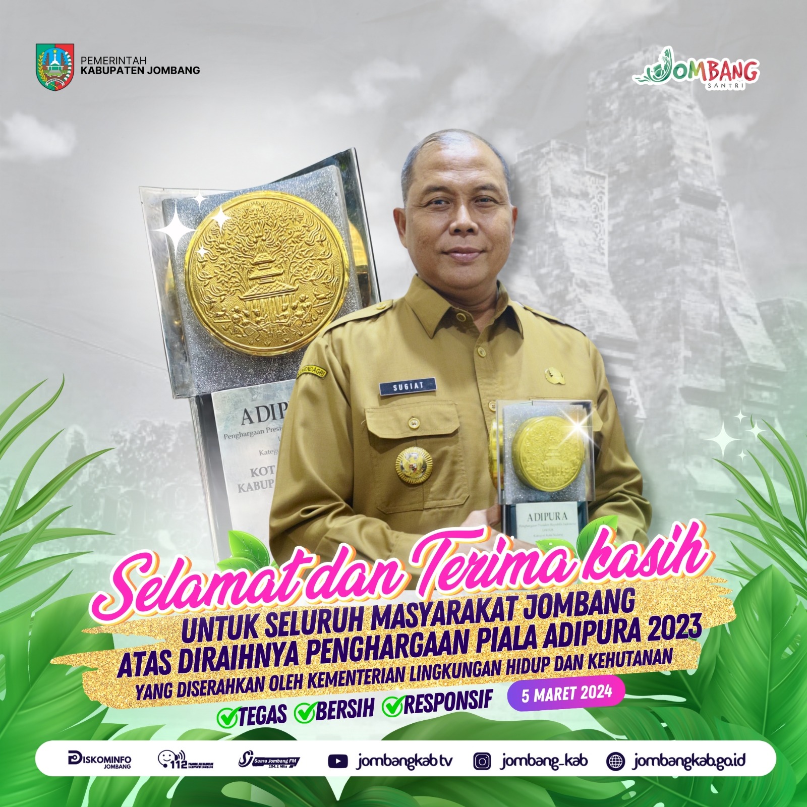 Kabupaten Jombang, menerima penghargaan tertinggi di bidang lingkungan hidup level nasional, yakni "Trophy Adipura Kategori Kota Sedang" Tahun Anggaran 2023 dari Presiden Republik Indonesia melalui Kementerian Lingkungan Hidup dan Kehutanan (KLHK) Republik Indonesia.